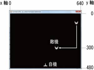 ゲームを起動すると、図2のように640×480の大きさのフィールドに自機が配置されます。自機の表示位置は、x軸が320、y軸が450です。画像ファイルは、x軸y軸を中心として画像が表示されます。自機はフィールド外に出ていかないように、x軸y軸の値を自動的に補正してくれます。敵機、自機弾、敵機弾は、フィールド外に行くと自動的に消滅します。