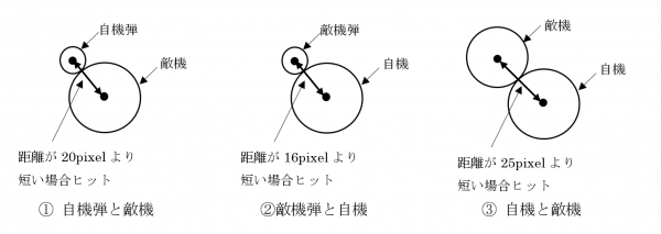 このゲームでは、①「自機弾と敵機」②「敵機弾と自機」③「自機と敵機」に当たり判定が設けられており、図2のようにキャラクターが近づく事により次の式が適用されます。当たり判定が実行され、lifeが0になるとキャラクターは消滅します。自機のlifeが0になると、自機が消滅し、画面に「GAME OVER」と表示されます。